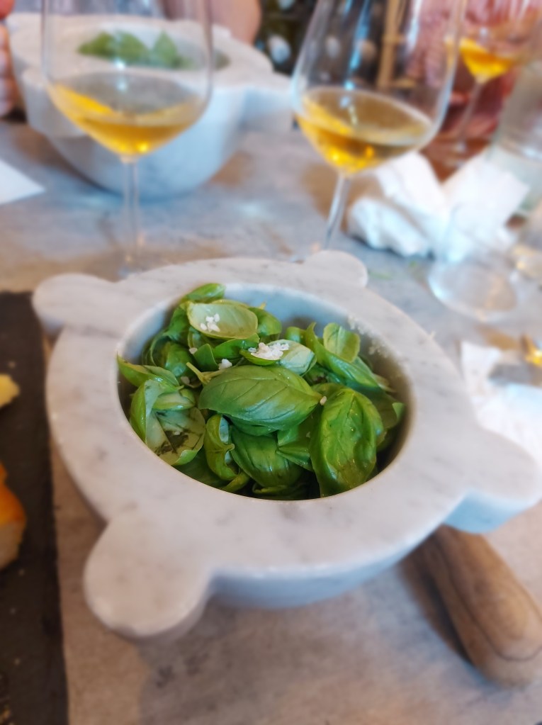 Il clou della nostra vacanza era segreta per Andrea. Ultimamente, si è messo in testa di imparare a cucinare e dedica una sera a settimana a quest’arte che sulla teoria conosce benissimo, ferrato da anni e anni di Masterchef. Ho deciso di metterlo alla prova e di regalarci la Pesto Experience, presso il locale Cinque Sensi di Vernazza, dedicato proprio alle degustazioni. Dopo lo shock iniziale, non se lo aspettava e ci è rimasto di stucco, si è lanciato volentieri alla scoperta dei segreti del pesto, spiegati dalla nostra ospite Sofia. Complice i calici di vino locale, gli gnocchi con il pesto fatto da noi sono stati ancora più buoni. Mi sono sempre piaciute le preparazioni al mortaio, mio papà prepara rigorosamente così il pesto alla trapanese. Sono belle perché ci vuole fatica, ci vuole tempo anche, ci vuole la voglia di preparare qualcosa di buonissimo, con meno di dieci ingredienti.